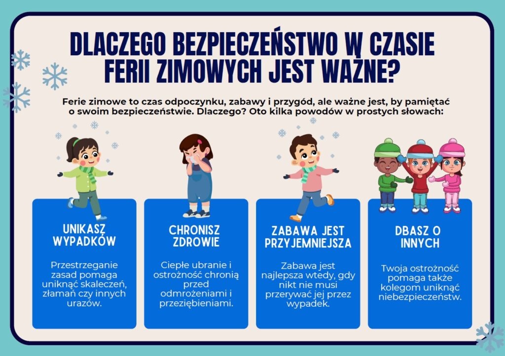 Ferie zimowe to dla dzieci wymarzony czas zabaw na śniegu i lodzie. Aby jednak przebiegły one szczęśliwie i wszyscy wypoczęci wrócili do swych domów, należy pamiętać o podstawowych zasadach bezpieczeństwa, obowiązujących tak podczas zorganizowanych wyjazdów zimowych, jak i spędzania tego czasu w miejscu zamieszkania: