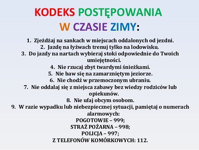 - Pamiętajcie o zachowaniu zasad bezpieczeństwa w czasie zimowych zabaw z kolegami, na stoku czy na lodowisku.